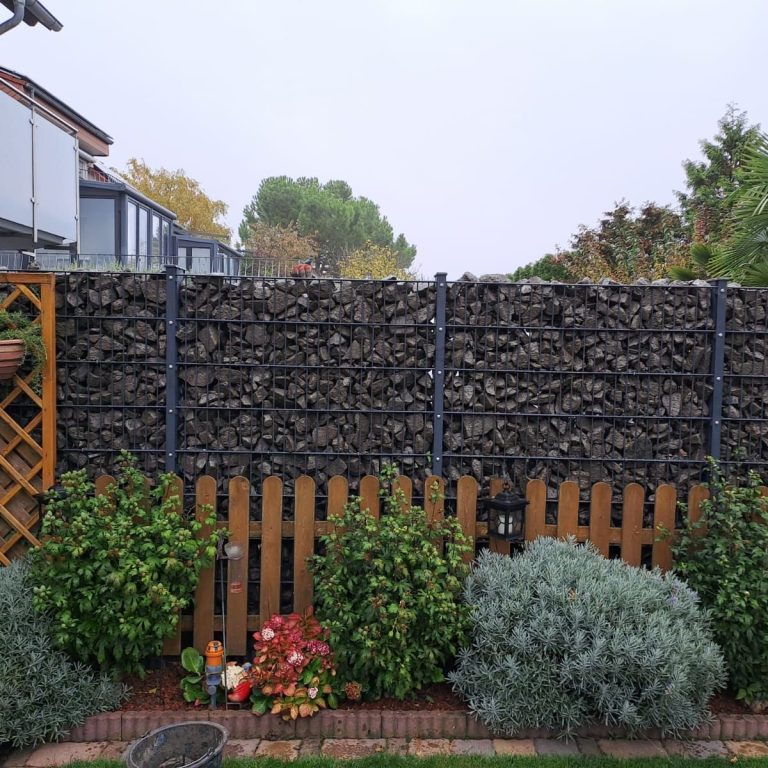 Durch die Kombination aus Gabionenwand, Holzelementen und abwechslungsreicher Bepflanzung entstand ein moderner Sichtschutz, der Funktion und Ästhetik vereint.