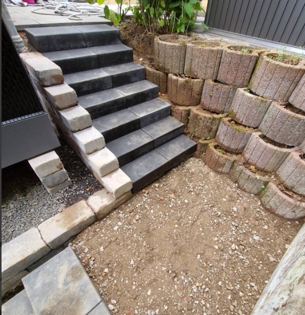 Der neue Treppenaufgang überzeugt durch ein modernes Design und hochwertige Ausführung – ein echter Blickfang! Die eleganten, dunkelgrauen Betonstufen führen harmonisch durch die liebevoll bepflanzten Seitenbereiche und verbinden Funktionalität mit ästhetischem Anspruch auf höchstem Niveau.
